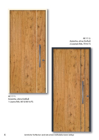 AE 17-2: Asteiche, ohne Ein uß 2 Lisenen RAL 7016 FS AE 17-1: AE 17-1: Asteiche, ohne Ein uß 1 Lisene RAL 9010/9016 FS 4 Sämtliche Tür ächen sind mit echten Vollholzfurnieren belegt