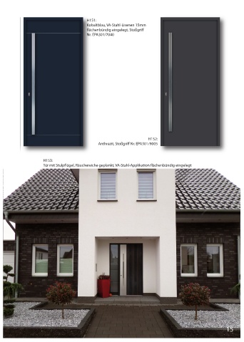 H151: Kobaltblau, VA-Stahl-Lisenen 15mm ächenbündig eingelegt, Stoßgri Nr. EPA301/7040 H152: Anthrazit, Stoßgri Nr. EPA301/9005 H153: Tür mit Stulp ügel, Räuchereiche geplankt, VA-Stahl-Applikation ächenbündig eingelegt 15