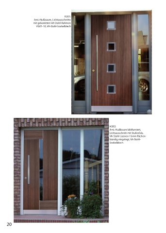 H201: Ami.-Nußbaum, Lichtausschnitte mit gekanteten VA-Stahl-Rahmen VG01-10, VA-Stahl-Sockelblech H202: Ami.-Nußbaum bildfurniert, Lichtausschnitt mit Stufenfalz, VA-Stahl-Lisenen 15mm ächen- bündig eingelegt, VA-Stahl- Sockelblech 20