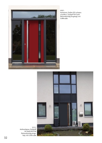 H321: Karminrot, Stufen-ISO schwarz emailliert, Stoßgri VA-Stahl ächenbündig eingelegt, mit Gri mulde H322: Anthrazitgrau, Stoßgri VA-Stahl/HF0798 ächenbündig einge- legt, mit Gri mulde 32
