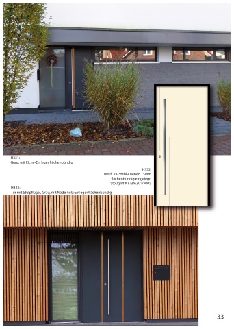 H331: Grau, mit Eiche-Einleger ächenbündig H332: Weiß, VA-Stahl-Lisenen 15mm ächenbündig eingelegt, Stoßgri Nr. EPA301/9005 H333: Tür mit Stulp ügel, Grau, mit Nadelholz-Einleger ächenbündig 33