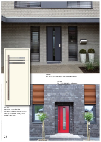 HA241: RAL 7016, Stufen-ISO-Glas schwarz emailliert HA243: RAL 3002, ISO-Glas teilmattiert HA242: RAL 9001, ISO-Glas klar, VA-Stahl-Lisenen 15mm ächen- bündig eingelegt, Stoßgri Nr. EPA 401/HF0793 24