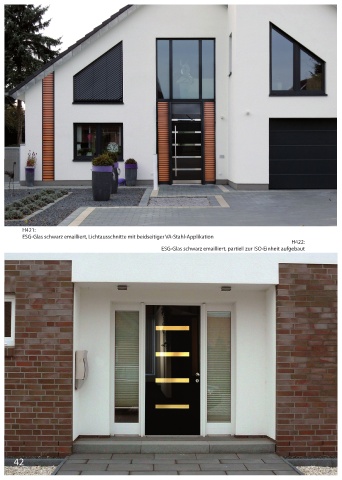H421: ESG-Glas schwarz emailliert, Lichtausschnitte mit beidseitiger VA-Stahl-Applikation H422: ESG-Glas schwarz emailliert, partiell zur ISO-Einheit aufgebaut 42