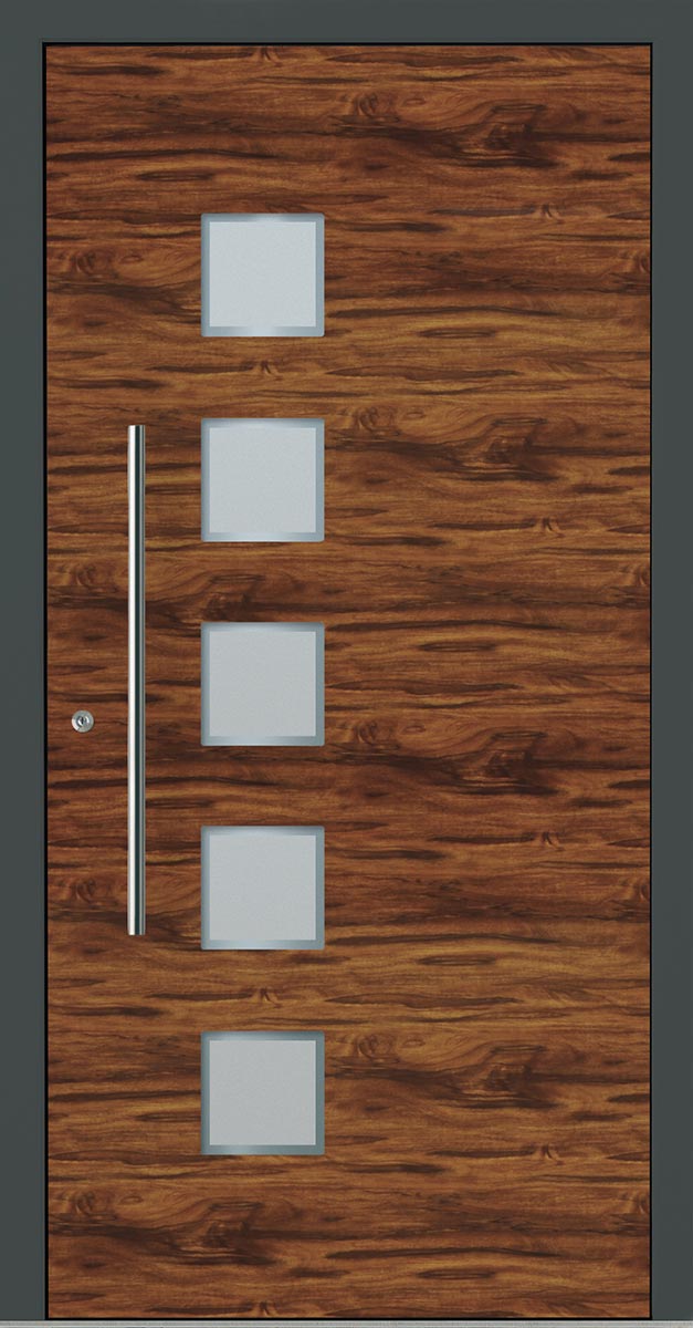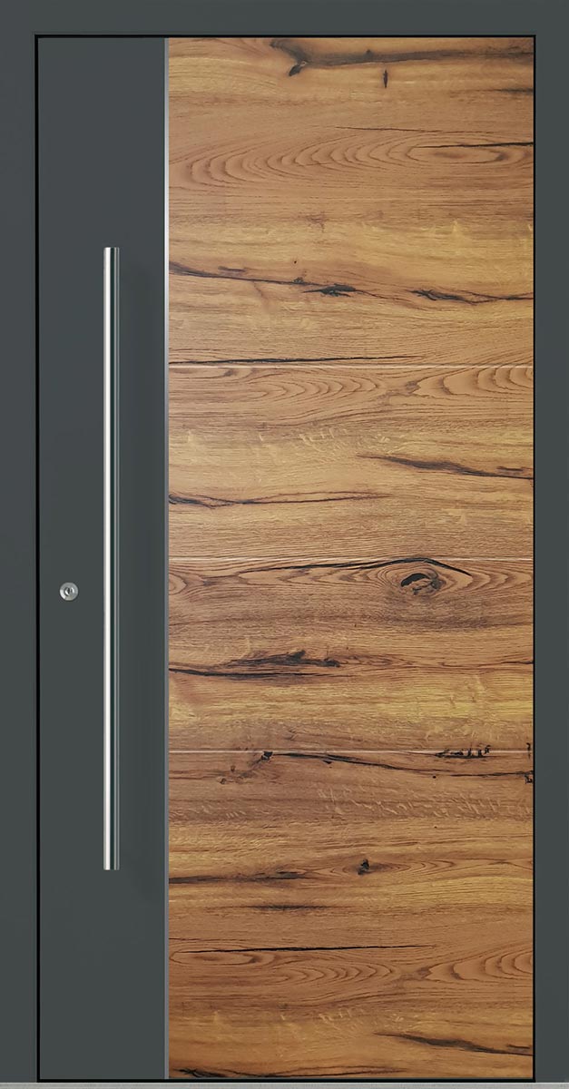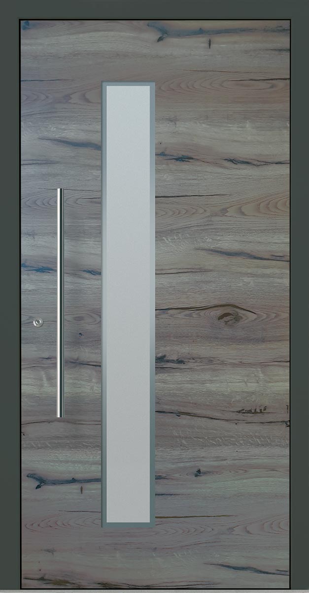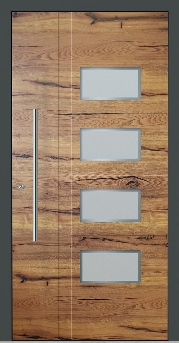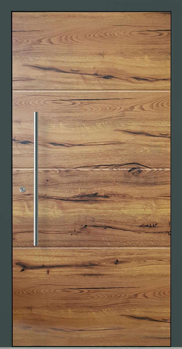 Durch eine spezielle Oberflächenbeschichtung gleicht die Optik echtem Holz. Sie ist jedoch wesentlich pflegeleichter und beständiger im Aussehen. Der Strukturverlauf variiert je Haustür.