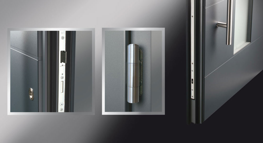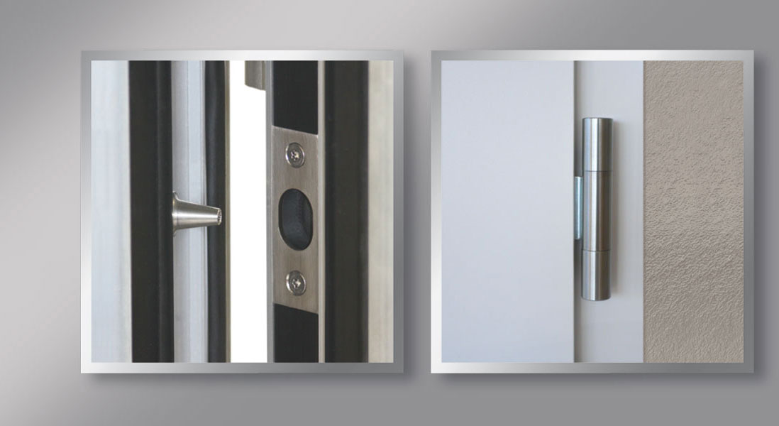 noblesse-AluDesign-Türen sind mit zwei Sicherungsbolzen auf der Bandseite ausgestattet, welche als solide Aushebelsicherung für erhöhten Einbruchschutz sorgen. Jede Tür hat in der Grundausstattung drei hochwertige Edelstahl-Rollenbänder, die 3-dimensional verstellbar sind und somit die optimale Einstellung der Tür gewährleisten (ohne Aushängen des Türflügels). Die Bandeinstellung liegt verdeckt. Bei den von noblesse eingesetzten Bändern wird die Dichtungsebene der Türkonstruktion NICHT unterbrochen.